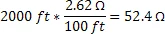변환기가 측정 장비에서 멀리 떨어져 있는 응용 분야에서는 루프 전력 계산에 와이어 저항을 고려해야 합니다. 구리선은 길이와 직경(게이지)에 정비례하는 DC 저항을 가지고 있습니다. 예제 시스템의 압력 트랜스듀서를 사용하여 전력 요구 사항에서 2000피트 거리를 계산해야 합니다. 24게이지 단선 구리선의 경우 내부 저항은 2.62 Ω/100피트[1]입니다. 이 저항 계산은 다음과 같습니다.