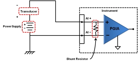 0mA 신호는 루프의 단절을 의미합니다. 데이터 수집 장치는 조정된 전류 흐름을 측정합니다. 전류를 측정하는 효과적이고 정확한 방법은 데이터 수집 디바이스 증폭기(그림 2)의 리드 사이에 정밀 션트 저항기를 배치하여 전류 신호를 전압 측정으로 변환하여 궁극적으로 트랜스듀서의 원래 측정과 다시 관련되도록 하는 것입니다.