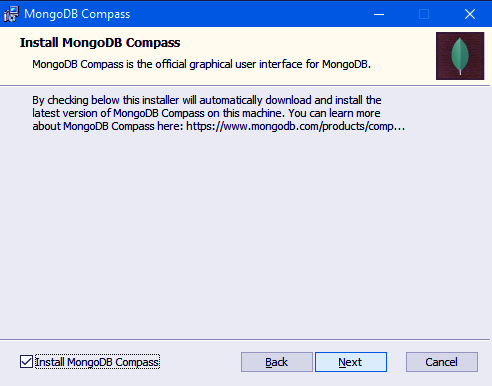 MongoDB serve 외에 MongoDB 나침반을 설치하는 옵션이 표시되며 MongoDB를 설치하려는 경우 확인란을 선택할 수 있습니다. 그렇지 않은 경우 비워 둡니다.