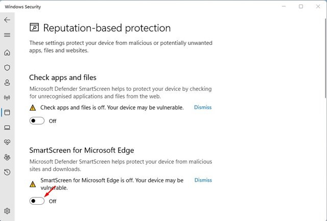 3. 아래로 스크롤하여 다음 화면에서 Microsoft Edge용 SmartScreen 토글을 비활성화합니다.