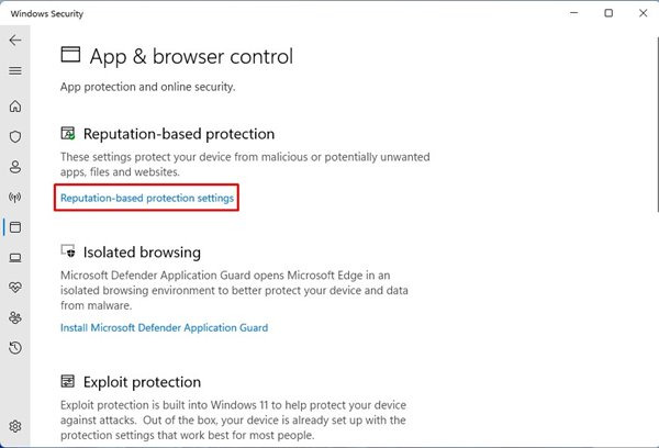 3. 아래로 스크롤하여 평판 기반 보호 설정 링크를 클릭합니다.