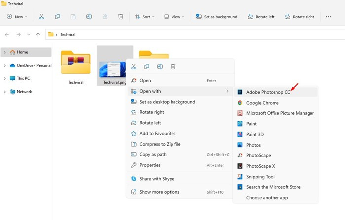 1. 변환하려는 PNG 파일을 마우스 오른쪽 버튼으로 클릭하고 Photoshop> 연결 프로그램을 선택합니다.