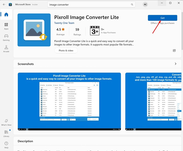 1. PC에서 Microsoft Store를 실행합니다. 그런 다음 Pixroll Image Converter Lite를 검색합니다.