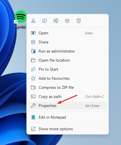 1. 바탕 화면에서 앱 바로가기를 마우스 오른쪽 버튼으로 클릭하고 속성을 선택합니다.