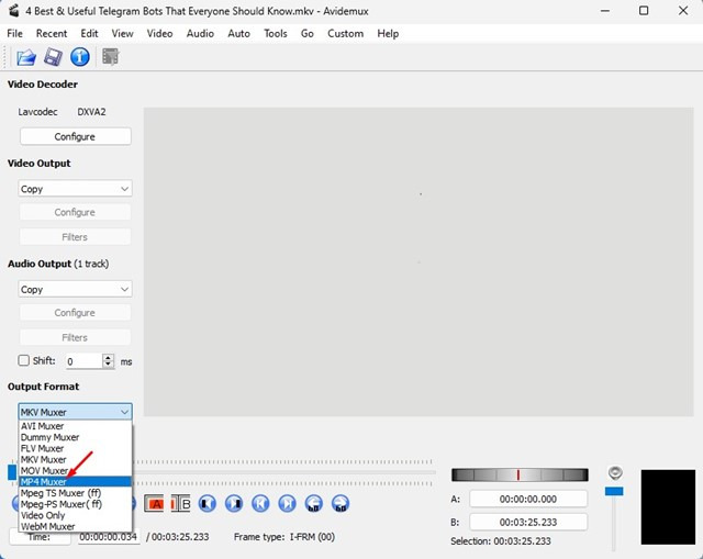 3. 출력 형식에 대한 드롭다운 메뉴를 클릭하고 MP4 muxer를 선택합니다.