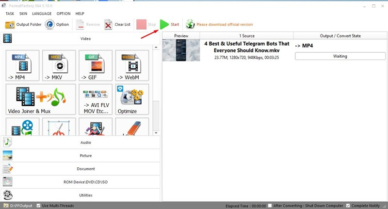 4. 시작 버튼을 클릭하여 비디오 변환을 시작합니다.
