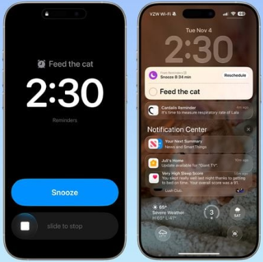 미리 알림 알람이 활성화되면 일시 중지 옵션 또는 슬라이드하여 중지 옵션이 표시됩니다. 일시 중지하면 미리 알림을 완료하거나 일정을 변경할 수 있는 옵션이 포함된 카운트다운이 잠금 화면에 표시됩니다. Apple은 미리 알림 알람을 새로운 파란색으로 표준 알람과 구별합니다.