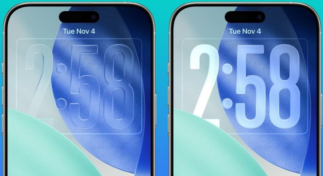 잠금 화면에는 시계의 모양을 사용자 지정할 수 있는 리퀴드 글래스 슬라이더가 있습니다. "글래스" 옵션을 사용할 때 슬라이더를 사용하여 시간을 거의 완전히 선명하게 보이게 하거나 더 반투명하게 보이게 할 수 있습니다.