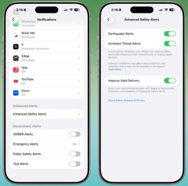 설정 앱의 알림 섹션에는 지진 경보, 임박한 위협 경보를 관리하고 위치를 사용하여 경고의 안정성을 향상시키는 기능인 향상된 경고 전달을 활성화하기 위한 향상된 안전 경고 섹션이 있습니다.