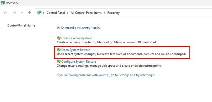 2. 고급 복구 도구 화면에서 시스템 복원 열기를 선택합니다.