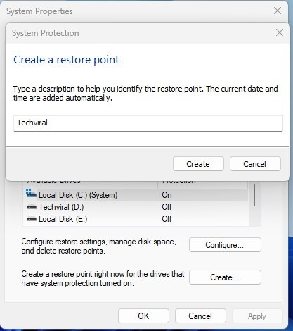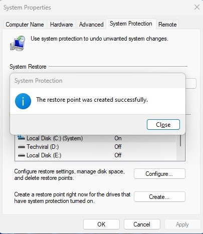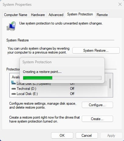 6. 시스템 보호가 복원 지점을 생성할 때까지 기다리십시오.
