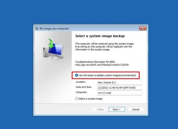 5. 시스템 이미지 백업 창을 선택하고 사용 가능한 최신 시스템 이미지 사용을 선택한 후 다음을 클릭합니다.