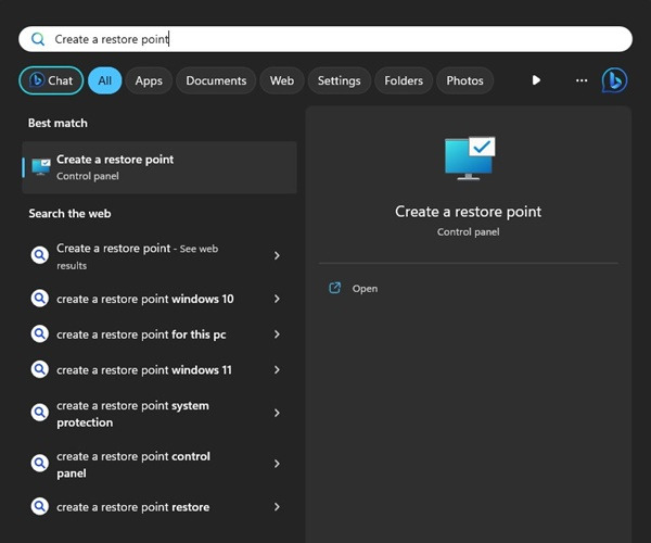 1. Windows 11 검색을 클릭하고 복원 지점을 입력합니다. 목록에서 복원 지점 만들기 앱을 엽니다.