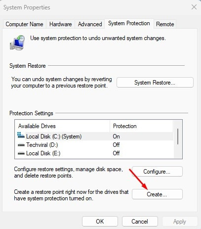 3. 시스템 복원 지점을 생성하려는 드라이브를 선택합니다.