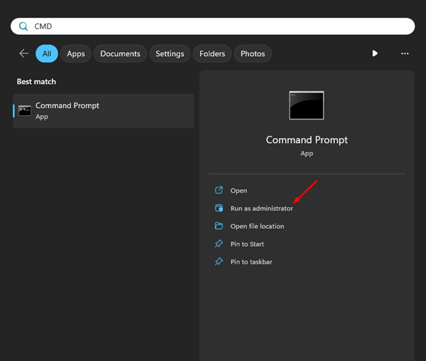 1. Windows 11 검색에 명령 프롬프트를 입력합니다. 그런 다음 CMD를 마우스 오른쪽 버튼으로 클릭하고 관리자 권한으로 실행을 선택합니다.