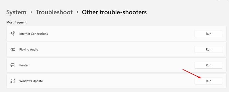 3. Windows 업데이트 옆에 있는 실행 버튼을 클릭합니다.