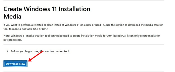 1. 이 웹페이지를 열고 Windows 11 설치 미디어 만들기에서 지금 다운로드 버튼을 클릭합니다.