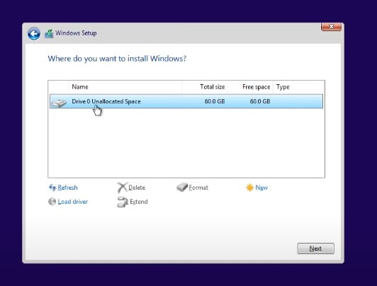7. Windows 11을 설치할 디스크 파티션을 선택하고 다음을 클릭합니다.