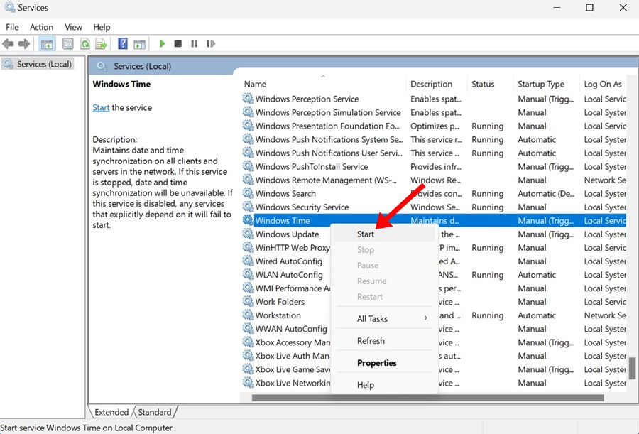 4. Windows Time을 우클릭하고 Start를 선택하세요. 이미 실행 중이라면, 우클릭해서 'Stop'을 선택한 다음 'Start'를 선택하세요.