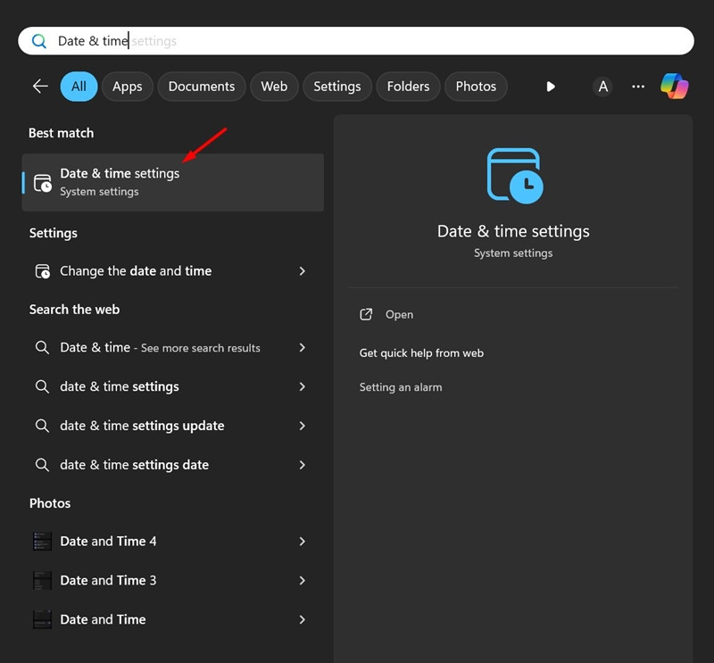 1. Windows 검색에서 날짜 및 시간 설정 옵션을 엽니다.