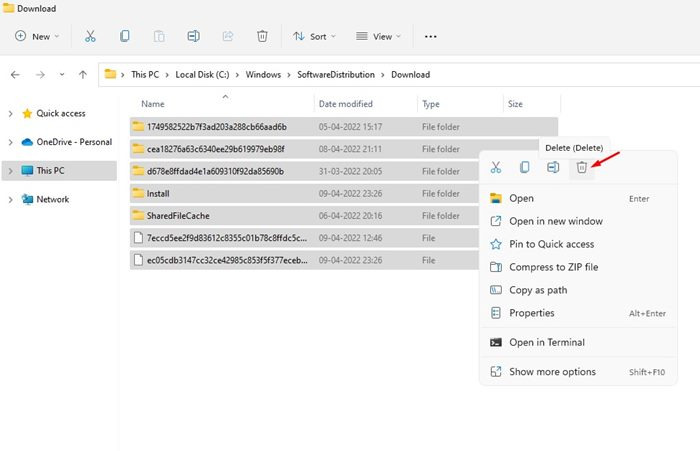 4. SoftwareDistribution 폴더에 있는 모든 파일과 폴더를 삭제합니다.