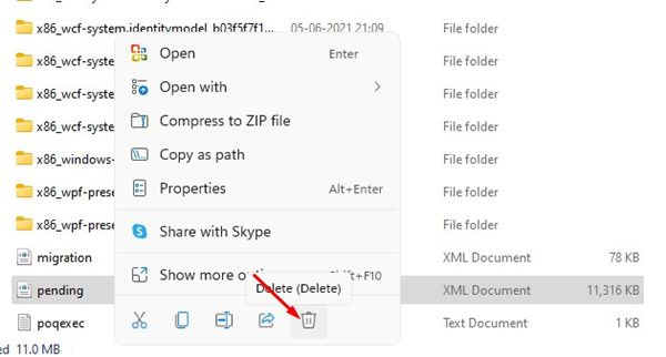 4. Pending.xml 파일을 우클릭하고 삭제를 선택하세요.
