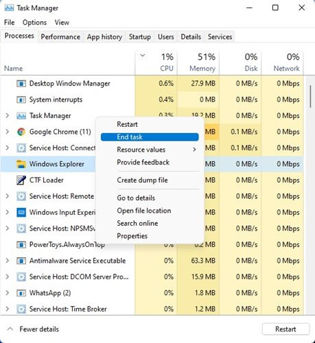 Explorer.exe 프로세스를 재시작하는 가장 쉬운 방법 중 하나는 작업 관리자에서 하는 것입니다.