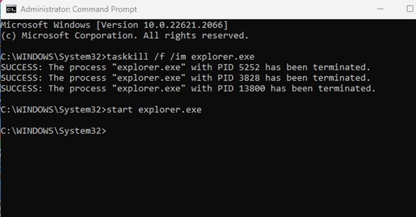 3. 백그라운드에서 Windows 탐색기 프로세스가 종료됩니다. 이제 다음 명령을 실행하여 다시 실행해야 합니다: