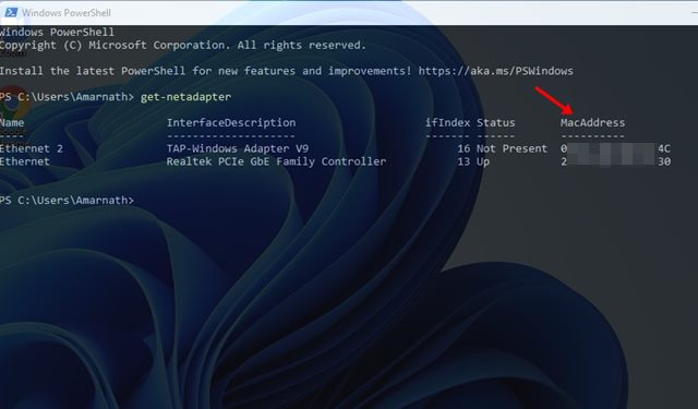 Windows 11에서는 PowerShell을 통해 MAC 주소를 찾을 수도 있습니다.