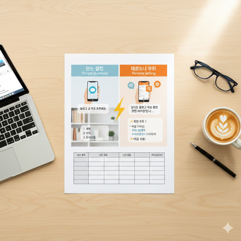 말로만 들으면 감이 잘 안 오시죠? 그래서 가장 흔한 주제 중 하나인 **'블로그 포스팅 기획'**을 예로 들어, AI에게 '단순 질문'했을 때와 '페르소나 부여'했을 때의 결과물이 어떻게 달라지는지 구체적으로 비교해 보았습니다.