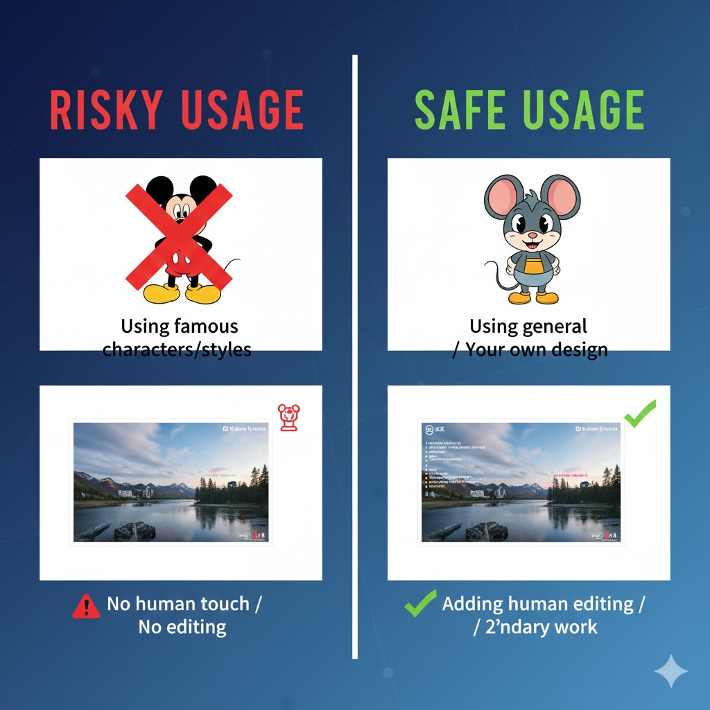 - 대책: AI가 만든 결과물을 **'재료'**라고 생각하세요. 캔바(Canva)나 포토샵을 활용해 텍스트를 추가하고, 색감을 보정하거나, 일부 구도를 수정하는 등의 리터칭 과정을 거치세요. 이렇게 '사람의 손길'이 닿는 순간, 법적으로 보호받는 2차적 저작물이 될 확률이 비약적으로 높아집니다.