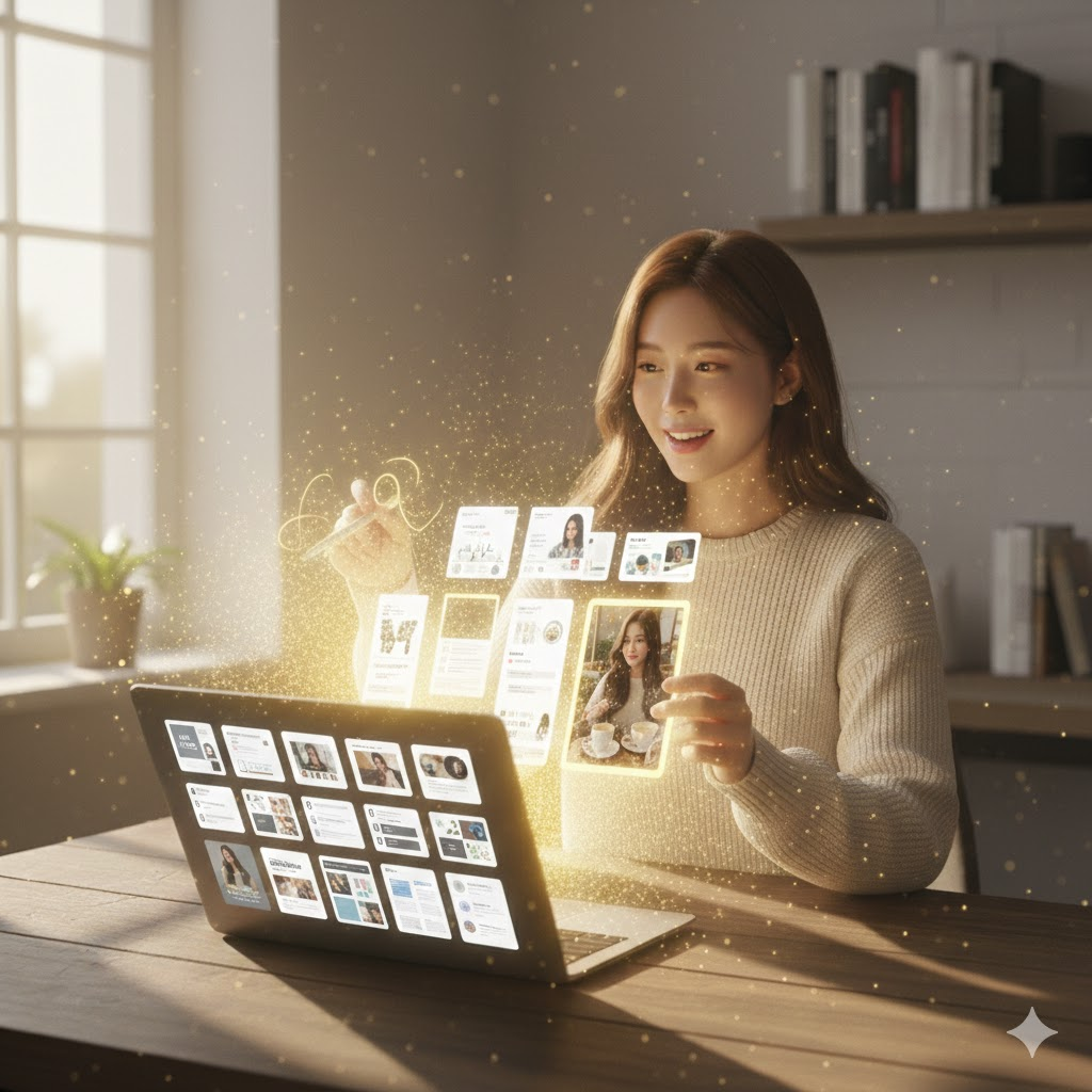 이미지와 문구가 준비되었다면 이제 그릇에 담을 차례입니다. 과거에는 포토샵 레이어와 씨름해야 했지만, 지금은 캔바(Canva) 같은 툴이 우리 대신 디자인의 90%를 해줍니다. 우리는 AI가 추천하는 레이아웃에 우리가 만든 재료를 '복사-붙여넣기'만 하면 됩니다.
