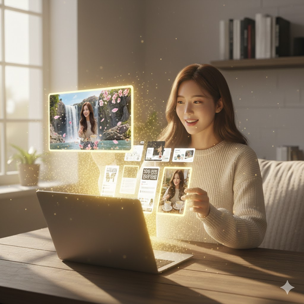 요즘 SNS 알고리즘은 정지된 이미지보다 짧은 영상(숏폼)을 훨씬 더 많이 노출해 줍니다. 7화까지 만든 고퀄리티 이미지를 그냥 두기엔 너무 아깝죠. AI 영상 생성 도구(Runway, Luma AI, Kling 등)를 활용하면, 프롬프트 한 줄로 사진 속 인물이 웃게 하거나 배경에 눈이 내리게 할 수 있습니다.