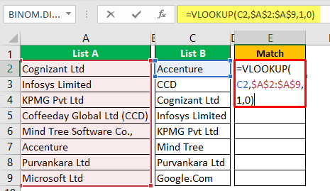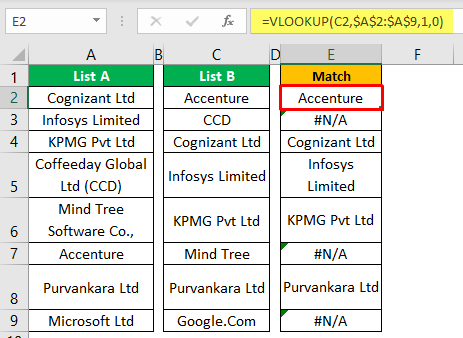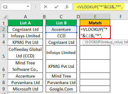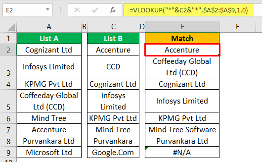 - 마찬가지로 C7 셀에는 "Mind Tree"라는 회사 이름이 있지만 "List A"(A6 셀)에는 전체 회사 이름이 "Mind Tree Software Co"이므로 "List A"에 추가 문자가 있습니다. 와일드카드 문자를 제공했기 때문에 단어의 나머지 부분과 일치하고 전체 결과를 반환했습니다.