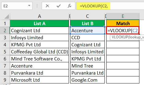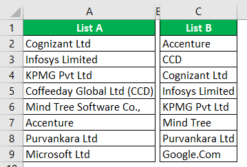그러나 "List B"의 행 번호 7 값은 "Mind Tree"이지만 "List A"에서는 동일한 회사 이름이 "Mind Tree Software Co"라는 완전한 단어로 쓰여 있습니다. (셀 A6).