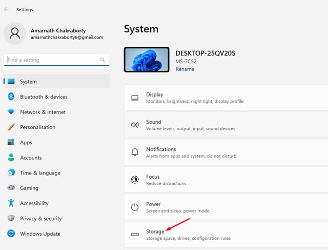 2. 시스템 > 스토리지로 전환합니다.
