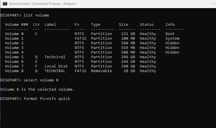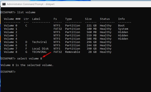 6. 위의 명령은 PC에서 사용 가능한 모든 볼륨과 해당 번호를 나열합니다. USB 드라이브의 볼륨 번호를 기록하고 볼륨 번호 선택 명령을 실행합니다.