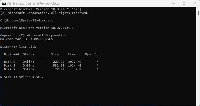 4. 다음 명령을 실행합니다: 디스크 + 숫자 선택(숫자를 USB 드라이브 옆에 표시된 실제 숫자로 바꿉니다). 예를 들어 디스크 2를 선택합니다.