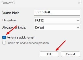 4. 형식 프롬프트에서 볼륨 레이블, 파일 시스템을 설정합니다. 빠른 포맷 수행을 선택하고 확인을 클릭합니다.
