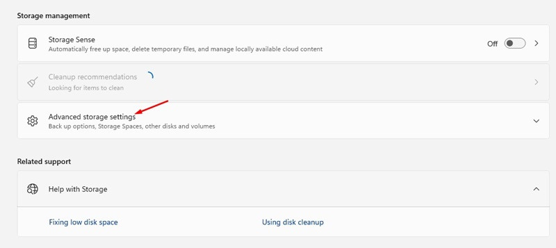3. 고급 스토리지 설정을 클릭합니다.